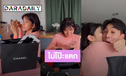 เมื่อแกะกล่องของขวัญออกมาก็เป็นเป็นที่คาดผม Celine กับแว่นตาจากแบรนด์หรู CHANEL “หนูนา” ดีใจมาก จนเดินเข้าไปหอมแก้มเพื่อขอบคุณ “จูเนียร์”