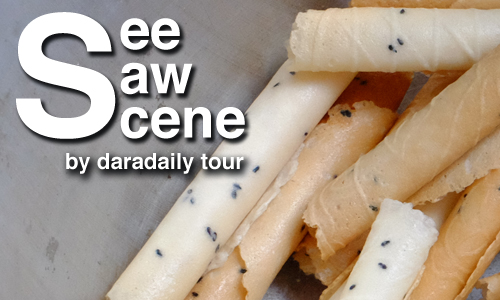 พอเข้าไปดูใกล้ๆ จึงเห็นว่า น้องนางนั่งขายทองม้วนอยู่ หน้าตาน่ารับประทานเป็นอย่างยิ่ง (ทองม้วน) ทางเราจึงตัดสินใจซื้อมาหนึ่งห่อถ้วน (ถ้าจำไม่ผิด ราคาแค่ประมาณ 20 บาทไทย) แกะห่อออกมา ทองม้วนยังร้อนๆ อยู่เลย